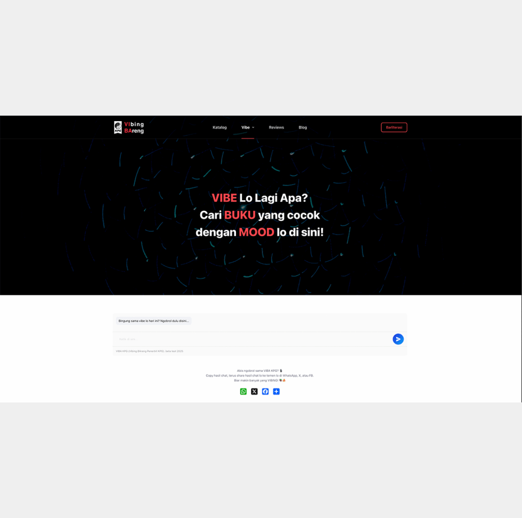 VIBA adalah psikolog tongkrongan + booktender pribadi lo dalam bentuk AI. Didesain buat nemenin lo ngobrol, overthinking bareng, dan nyari bacaan yang klik sama mood lo hari ini — entah lo lagi pengen kabur dari realita, ngambang di eksistensi, atau sekadar bengong di kloset.