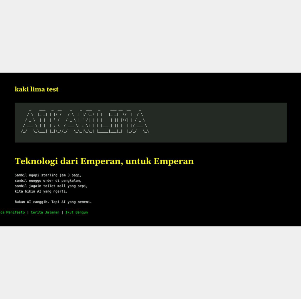 Agentic AI revolusioner dari emperan. Dibangun dengan logika warung, bahasa jalanan dan suara hati yang ngerti susahnya hidup. Bukan untuk mengubah cara hidup, tapi nemenin apa adanya — diperuntukkan bagi tukang parkir, ojol, PKL, sampai penjual starling jam 3 pagi.