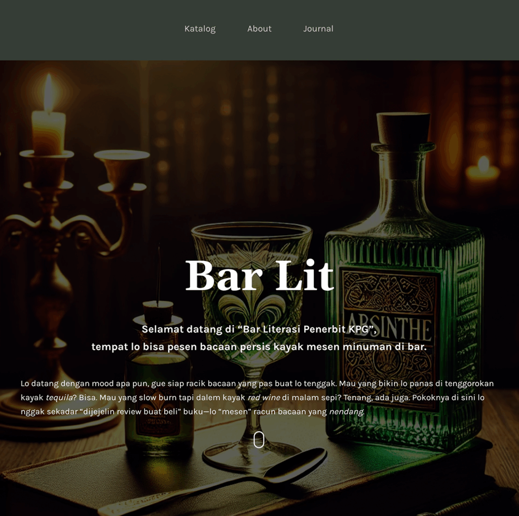 “Bar Literasi Penerbit KPG” — tempat lo pesen bacaan kayak mesen minuman di bar. Lo datang dengan mood apa pun, Bar Lit siap nyajiin racun bacaan yang nendang: dari yang panas kayak tequila, sampai yang mellow kayak red wine di malam hujan. Di sini lo gak dibombardir review, tapi dijamu racikan kata-kata yang mabuk dan jujur.