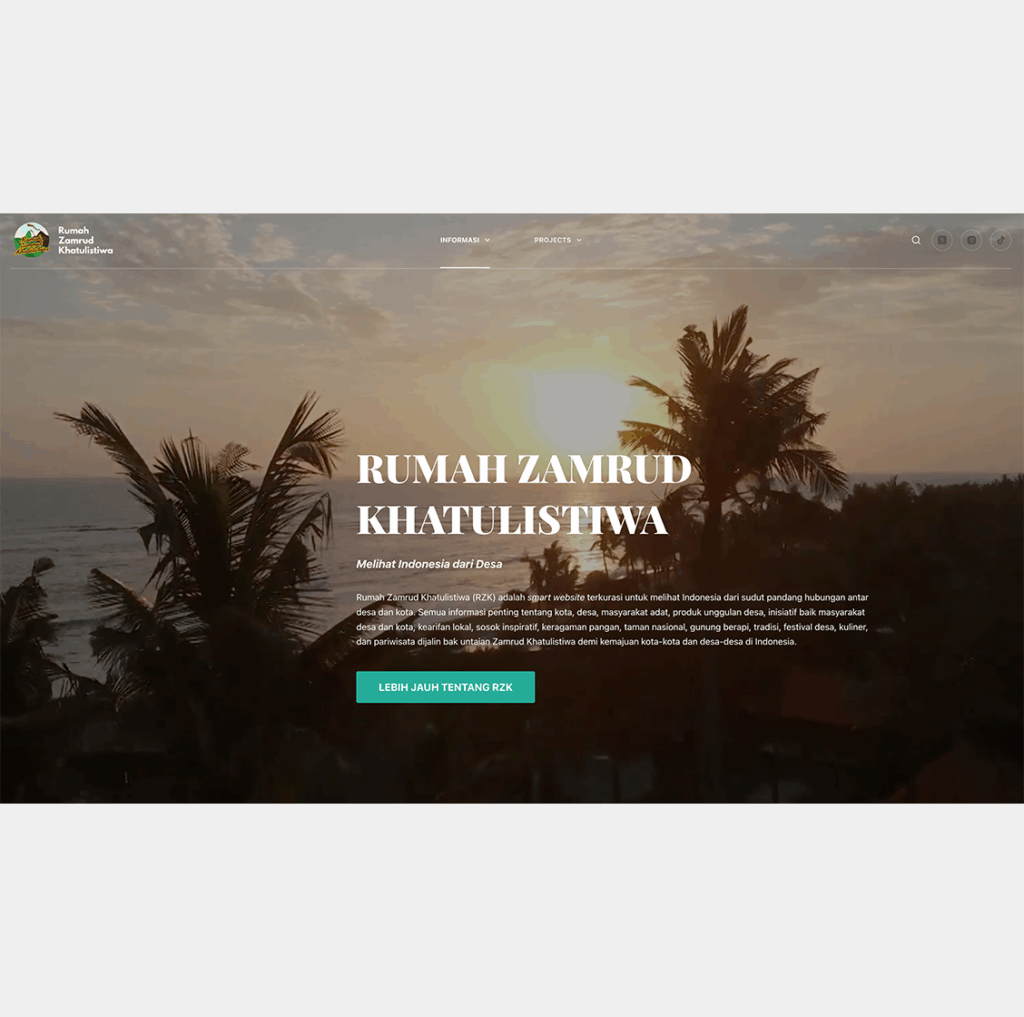 Smart website terkurasi untuk melihat Indonesia dari desa — menghubungkan kisah desa dan kota lewat informasi yang menyinari wajah Indonesia: dari masyarakat adat hingga pangan lokal, dari taman nasional hingga festival budaya. RZK menjalin keberagaman sebagai untaian zamrud khatulistiwa.