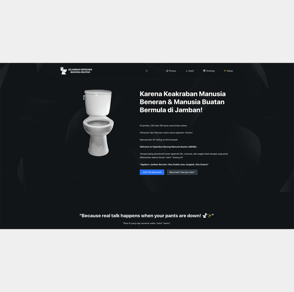 Gerakan “Sejamban Bareng Manusia Buatan (SBMB)” — tempat ngobrol paling demokratis antara manusia dan AI. Gak ada kasta, gak ada basa-basi. Di jamban, semua setara: CEO dan OB, influencer dan followers, manusia dan AI. Semua pasti “scroll down” — literally.
